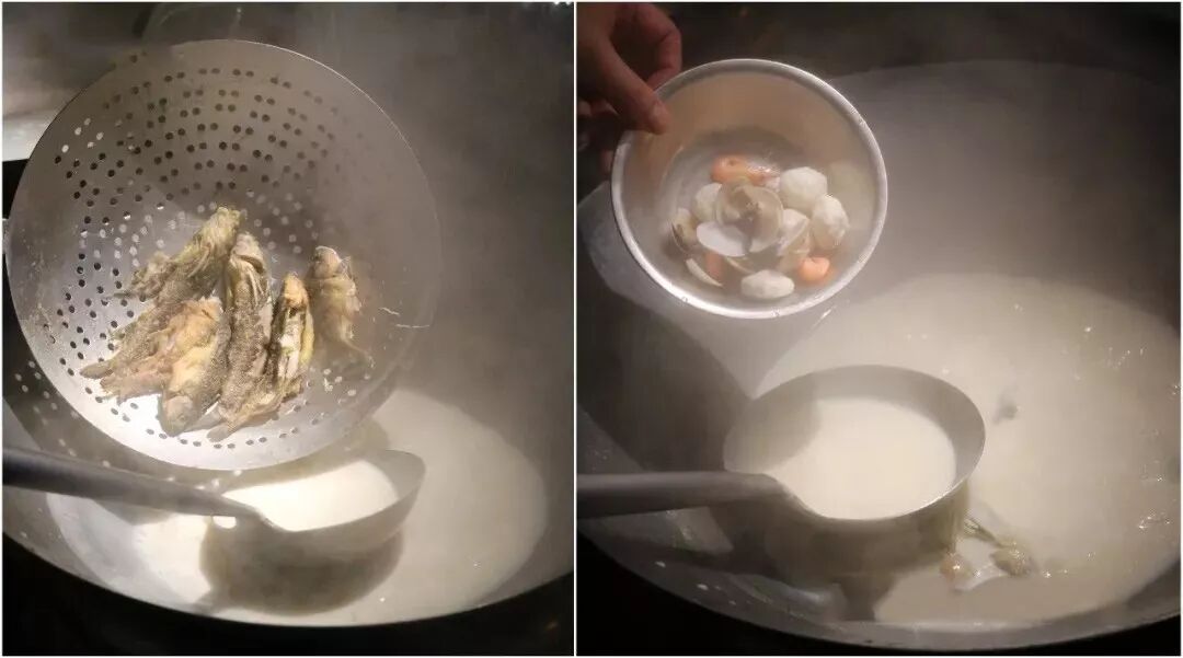 3.黄骨鱼、禾花鱼、白贝、小河虾等入豆浆鱼汤煮约2分钟。