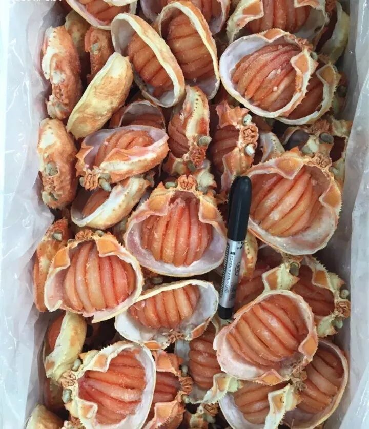 最近一段时间,这种半成品蟹斗十分走俏,它以雪蟹为原料,将蟹钳、蟹身中的肉拆开后填入蟹壳,解冻后便可制作,进货价8元/只。