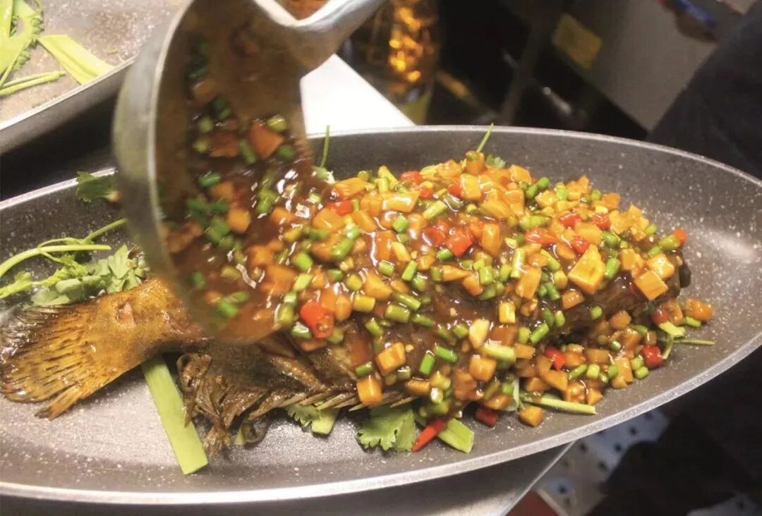 4、另起锅煸炒小料,加原汤熬浓勾芡,盖到鳜鱼上即可。