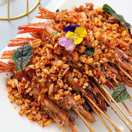 1. 将基围虾开背改刀后,加腌料腌制串起炸香炸熟,沥净摆盘;