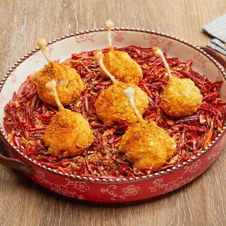 1. 牛蛙腿改刀退骨留主骨,肉成球用腌制料腌制30分钟,沥干后冷冻成形待用;