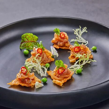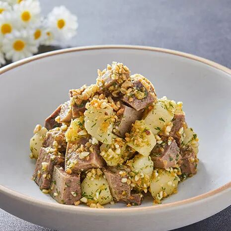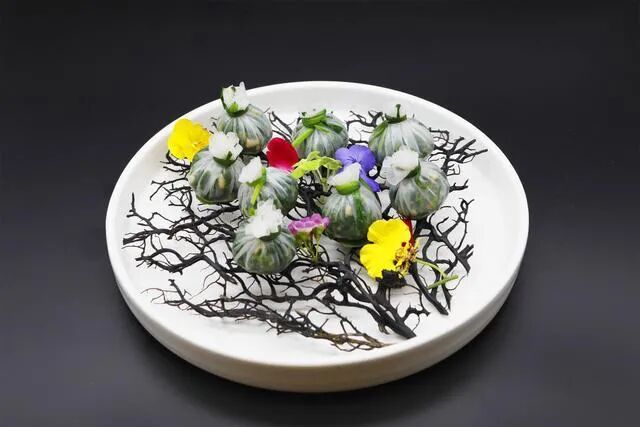 5. 花生碎、炸金蒜混合均匀,装盘底,放上牛舌卷,点缀花草即可。