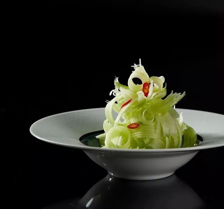 1. 马家沟芹菜剖开切段,放入冰水中浸泡30分钟后,自然成卷,装盘;