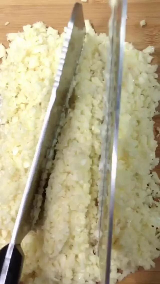 1、大蒜用刀面逐粒拍碎,再混合在一起剁成蒜末,饭店的厨师都是如此加工的,也是最为快速的一种方法,熟练的师傅操作起来速度不比搅拌器来的慢。