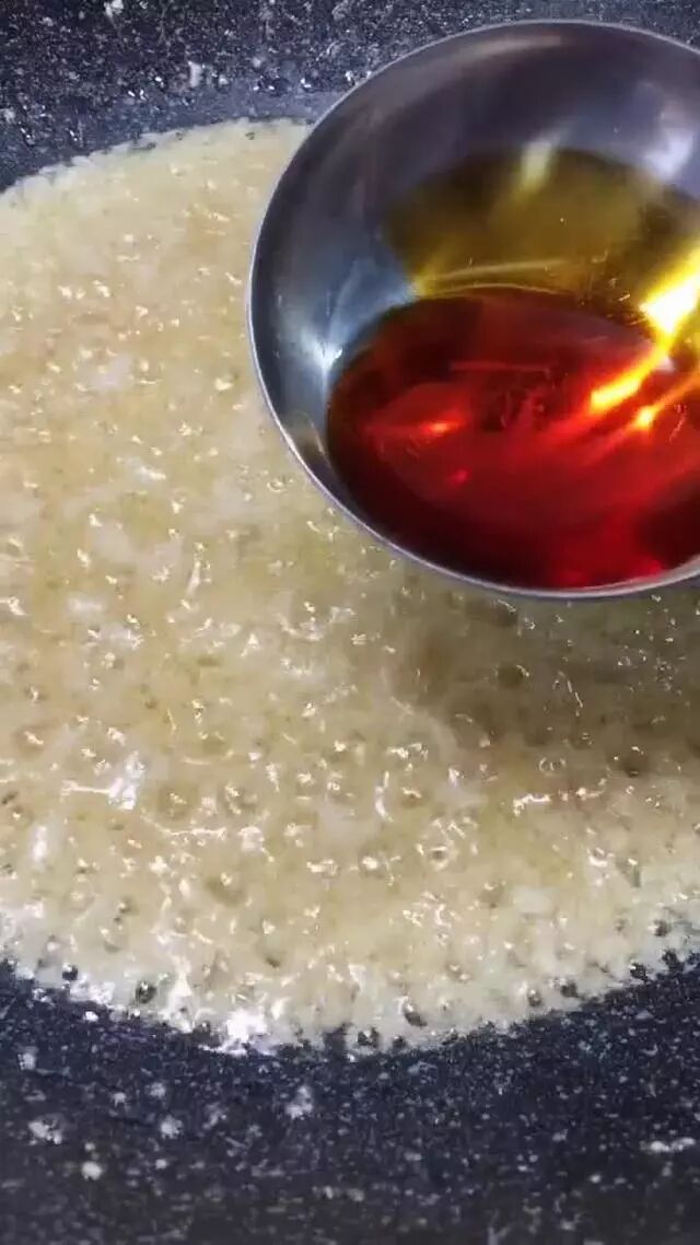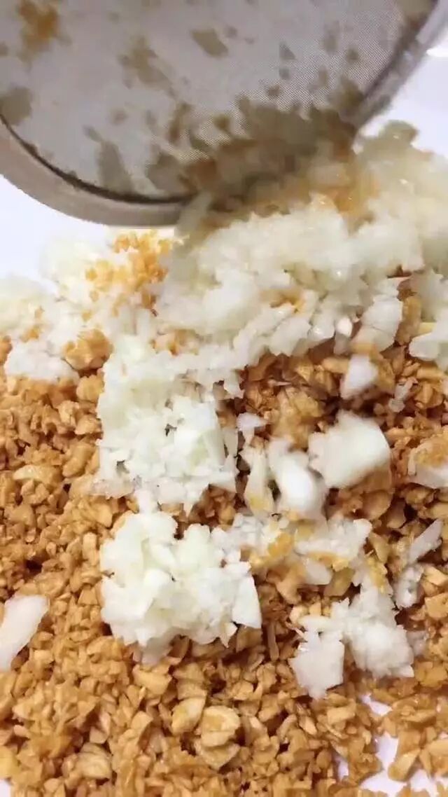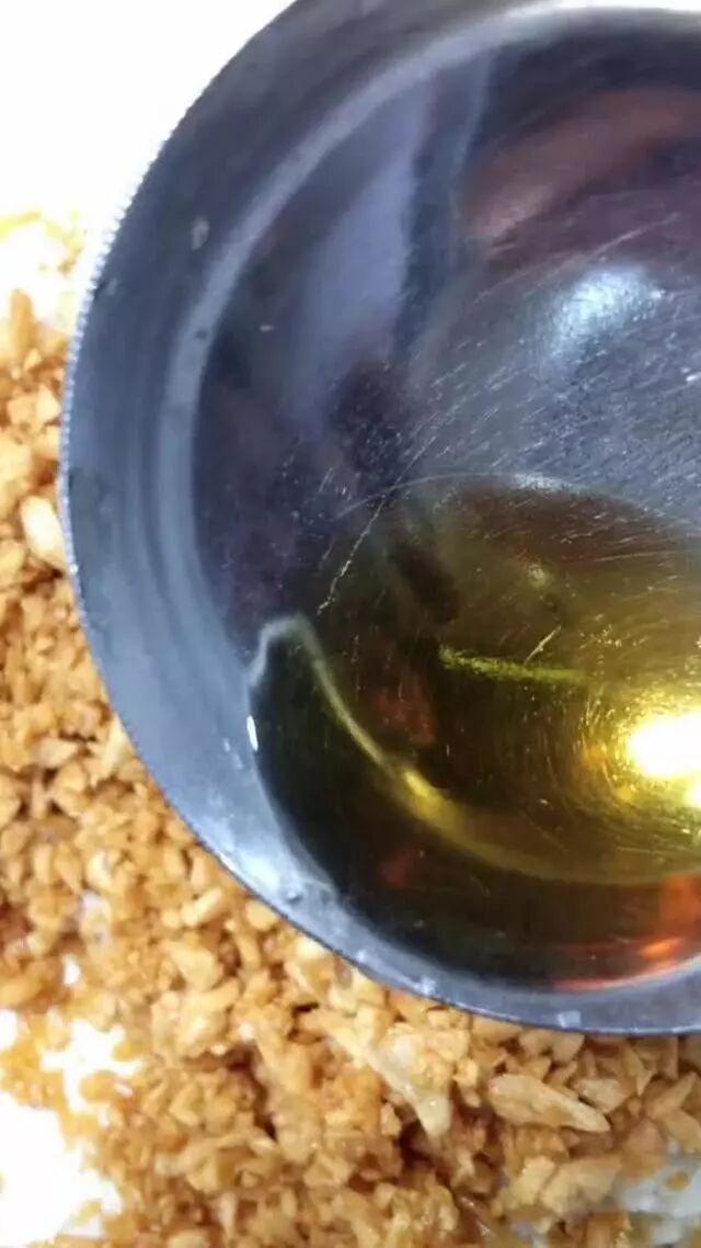 4、然后倒入一半的生蒜蓉倒入油中,搅拌均匀后再加入适量的红油,将它炸至金黄捞出,装入碗中备用,这就是所谓的“金蒜”。