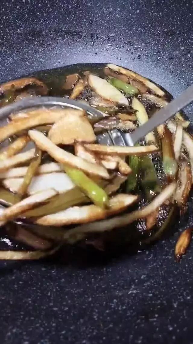 3、锅中倒入适量的植物油,待油烧至4-5成热时,再将连葱段、姜片、洋葱,用热油将它们炸出香香味,直到将它们炸干为止,再将残渣捞出,倒掉放弃不用,利用余下的油来炸蒜蓉。