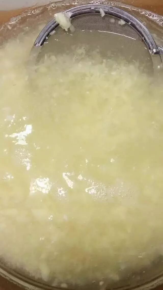 2、将剁好的蒜末放入清水中淘洗1-2遍,然后找个漏勺将它们捞出来,装入碗中备用,这样做的目的,一是为了能保存更长的时间,二是蒜蓉不易变黑,算是一个小窍门吧!