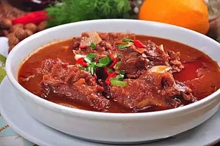 3、 葱姜蒜入锅加菜籽油炸香,以1:1:1的比例加入辣酱、蚕豆酱、黄豆酱, 炒香后加入所有香料,加沸水,放入牛盖骨,加腿骨汤、生抽、蚝油、胡椒、辣椒、料酒调味,大火烧开10分钟,下火慢炖至软糯。