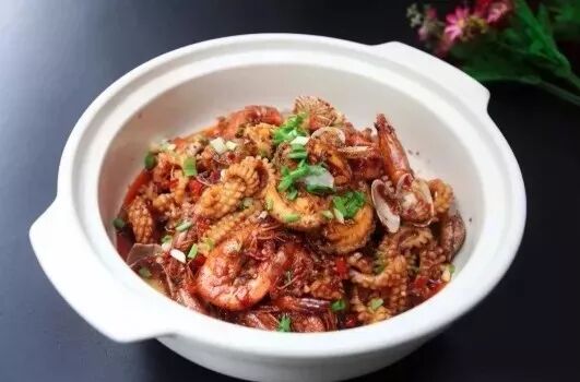 6.将已过油的海鲜倒入锅中翻炒,加入啤酒、味精、鸡精、蚝油、蒸鱼豉油, 生抽调味即可。