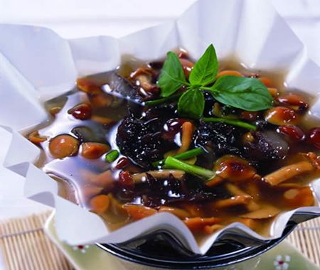 2、锅入上汤,下滑子菇、海参烧开,下调料调味,勾芡倒入纸锅中。