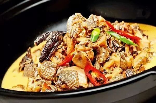 3.锅内放入茶油100克,烧至五成热时,放入姜片100克和鸡块,中火煸炒至肉变色,倒入鸡汤没过表面,下入三种菌菇,用生抽20克,老抽3克,盐、鸡粉各8克调味,大火烧开,改小火焖20分钟,大火收浓汤汁,出锅装入沙锅内,撒入青、红辣椒圈各2克,上桌后加热食用。
