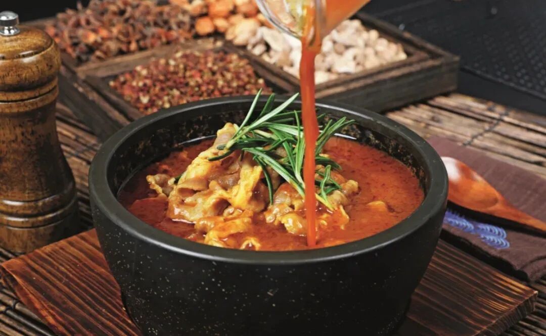 3.汤底勾薄芡淋入石锅内,表面淋葱油8克,用迷迭香叶5克点缀即可。