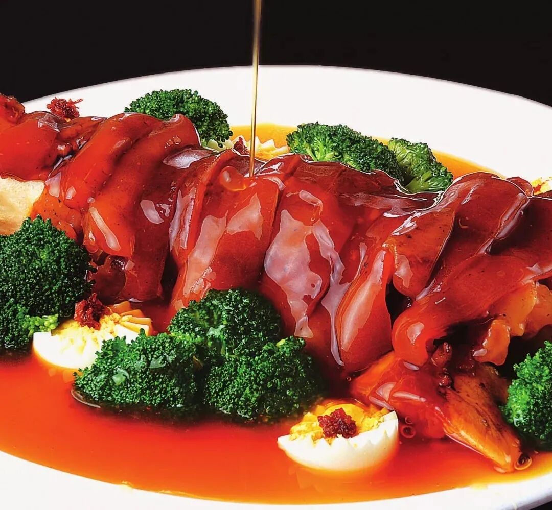 2.放入酱好后的牛蹄1个,烧制5分钟,关火后将牛蹄捞出,摆在主骨上方改刀以便食用,用煮熟的西兰花300克和鸡蛋(一切二)120克摆旁边。