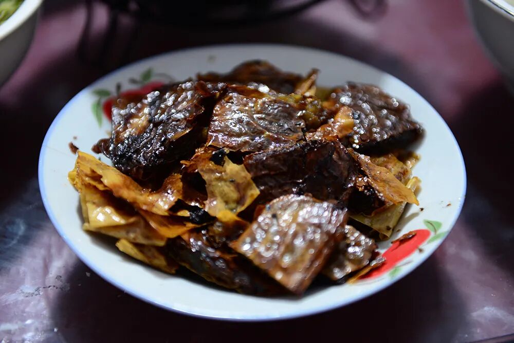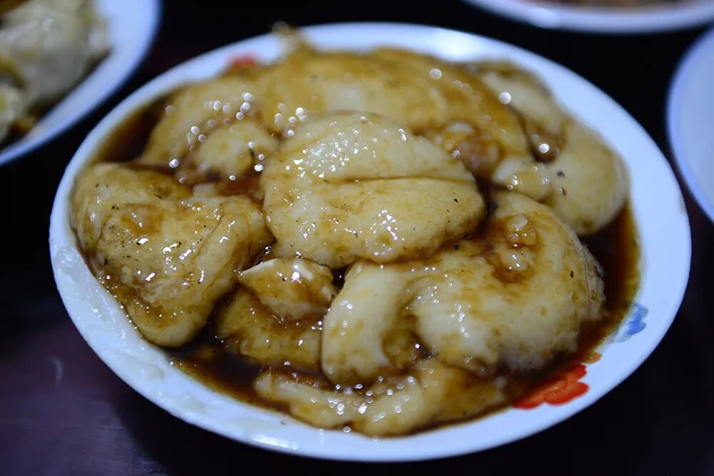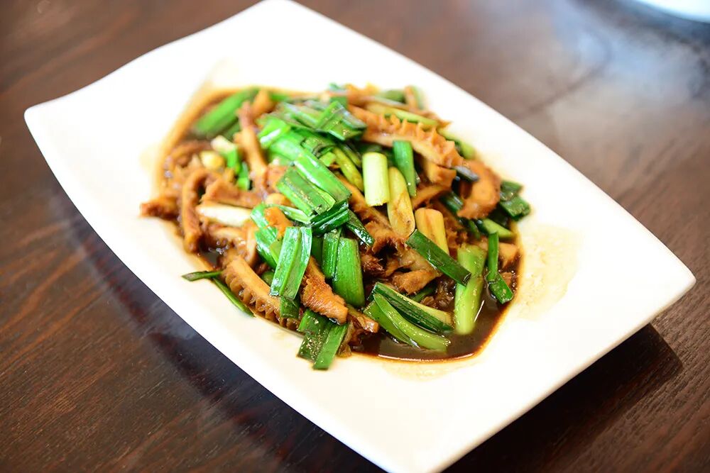㸆是鲁菜中常用的烹调技法,也是较为复杂的一种。㸆法宋代已有,写作“焅”。如“焅腰子”、“五味焅鸡”、“葱焅骨头”等(见《梦粱录》),直到清代晚期才有㸆字,如孔府菜中的“㸆虾”。所谓“㸆”就是将经过炸、煎、炒或水煮的原料,用葱、姜炝锅,加入适量鲜汤和调味品,先用旺火烧开,再转中小火长时间加热收汁,使调味品的滋味慢慢地渗入主料内部,达到香透入味的一种烹调方法。在㸆菜的技法中,拢芡与收汁是较为关键和复杂的一种技巧,具有成菜后形美、味醇、原汁原味、明油亮芡的特点,因此㸆菜多为筵席的上乘菜肴。