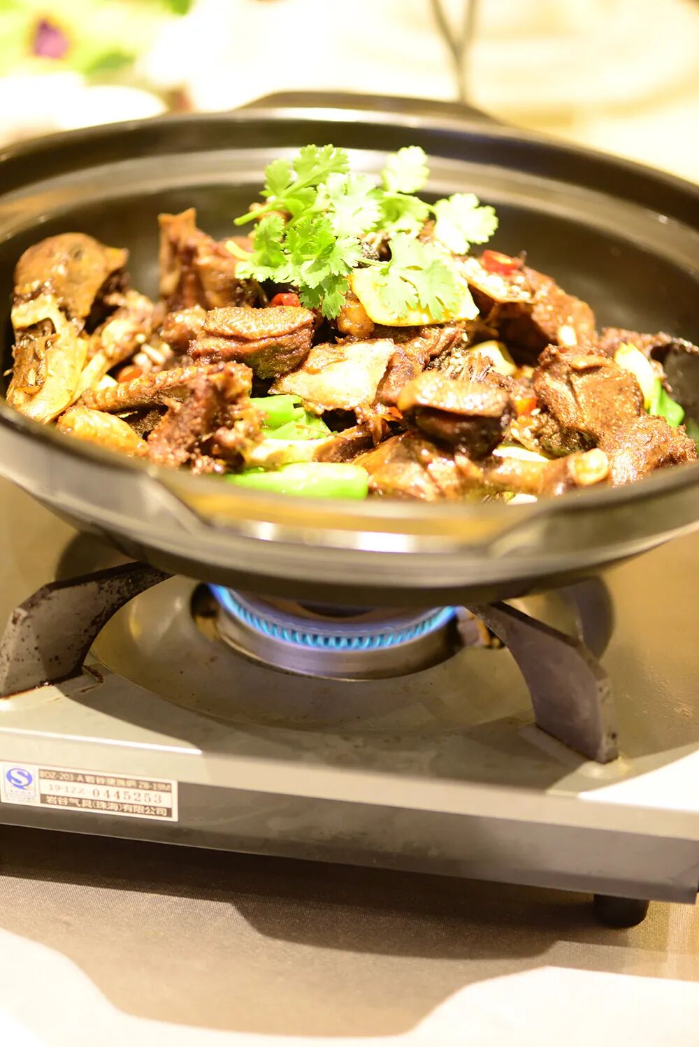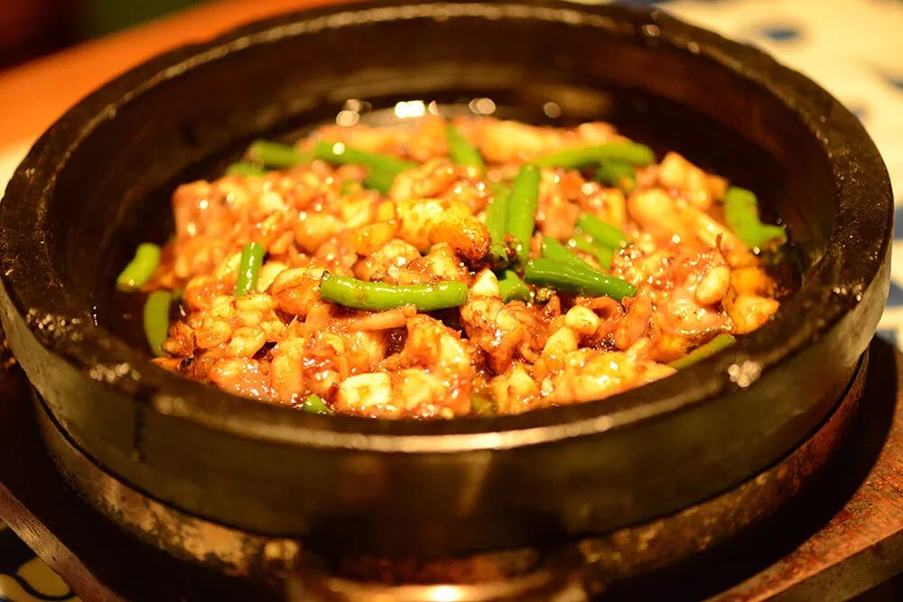 焗,以汤汁、蒸气、盐粒等为传热媒介,将禽类、海鲜为主的动物性原料,经刀工处理、调味腌制或半成品,通过一定的方式加热至熟成菜的一种烹调方法。焗原是西餐中一种常见的烹调方法,这一点从西式菜肴名称中就可以看出,如西班牙海鲜焗饭、生焗出骨鳕鱼等。焗这种烹调方法便是中外烹饪文化交流的结果。厨师们将之拿来后结合本地实际,不断实践总结,不断创新和发展这种技法,使焗成为了有别于西餐焗的一种完善的烹调方法。例如上汤焗龙虾,主料选用大只澳洲深海龙虾,以火腿、老鸡熬制十小时的上汤烹煮,肉质爽甜弹牙,口感格外鲜美。