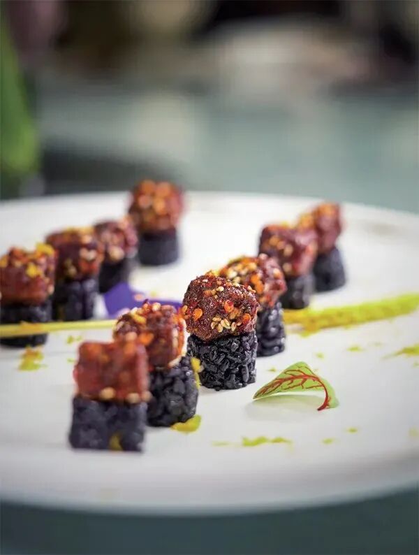 6.走菜时,将黑米条切成与肉大小一致的丁,放入微波炉打半分钟,摆入盘中,在每块黑米丁上摆上肉丁,稍加点缀即成。