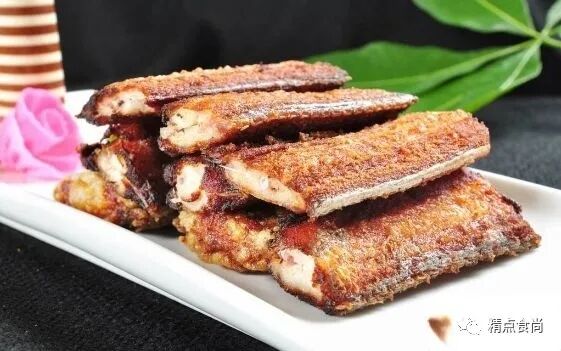 3、腌制好的带鱼控干水分,放8 层油温炸金黄色,带鱼外酥里嫩,外面金黄色.整齐摆在托盘里面(炸的时候油温高点,用干净油.炸到表面金黄金黄就可以)
