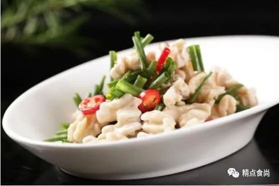 4、猪腰两个,改花刀,用姜葱花椒水料酒腌制半小时控干水分,锅里水烧开倒入腰花,开锅断生就捞起来冲凉,控干水分和烧椒汁水一起搅拌,关注精点食尚公众号,每天分享三篇好配方,烧椒腰花就做好了。