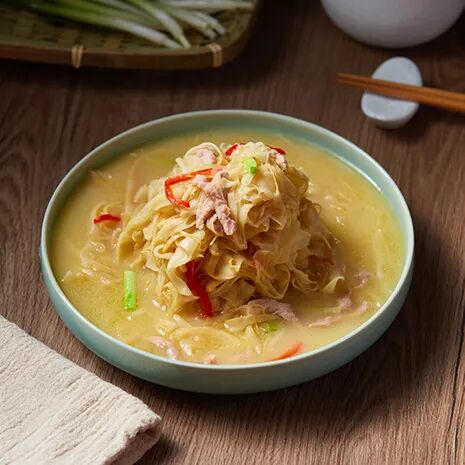 2. 锅内入少许猪油,炒香姜丝和笋丝,入汤水烧开,调味后入肉丝煮出味至成熟即可出锅装盘撒上葱花和红椒丝。