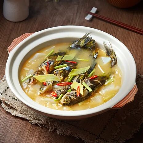 2. 锅中入少许油煎香黄骨鱼,加入汤烧开至奶白后,下白萝卜片、龙骨煮出香味至成熟调味,装入锅中撒葱段即可。