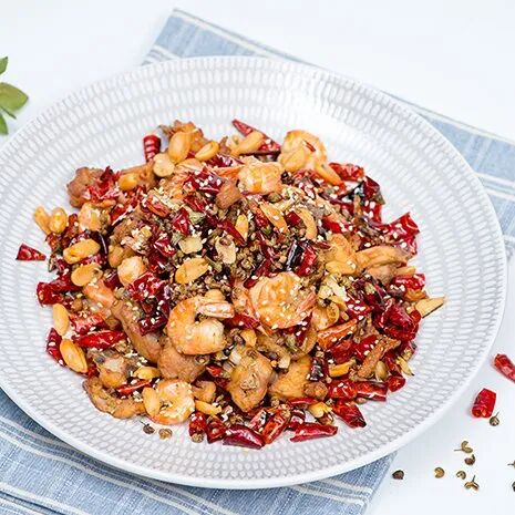 2. 鸡肉和虾下锅炸香,炒香辣椒和小料,调味炒匀,加入麻辣花生装盘即可。