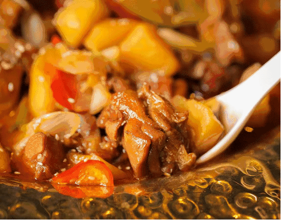 牛肉、咖喱鸡丝等,也可将腌制的鱼块、鸡块炸熟后收汁,其味型特点是咸辣、鲜香、开味。