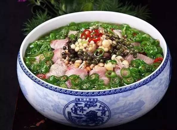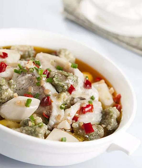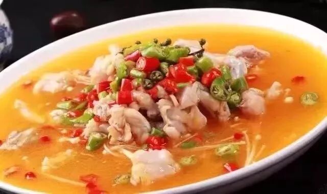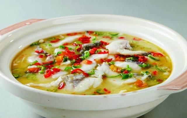 (3)净锅上火,下150克色拉油烧至五成热,下自制鲜椒酱料炒香,加1500克清水烧开,熬至1200克时,用密漏捞出料渣,用盐8克,味精6克,浓缩鸡汁5克,白醋10克,白糖3克调味,下鱼块煮熟,捞出,铺在碗中,再下鱼片汆熟后带汤一起盛入大碗。