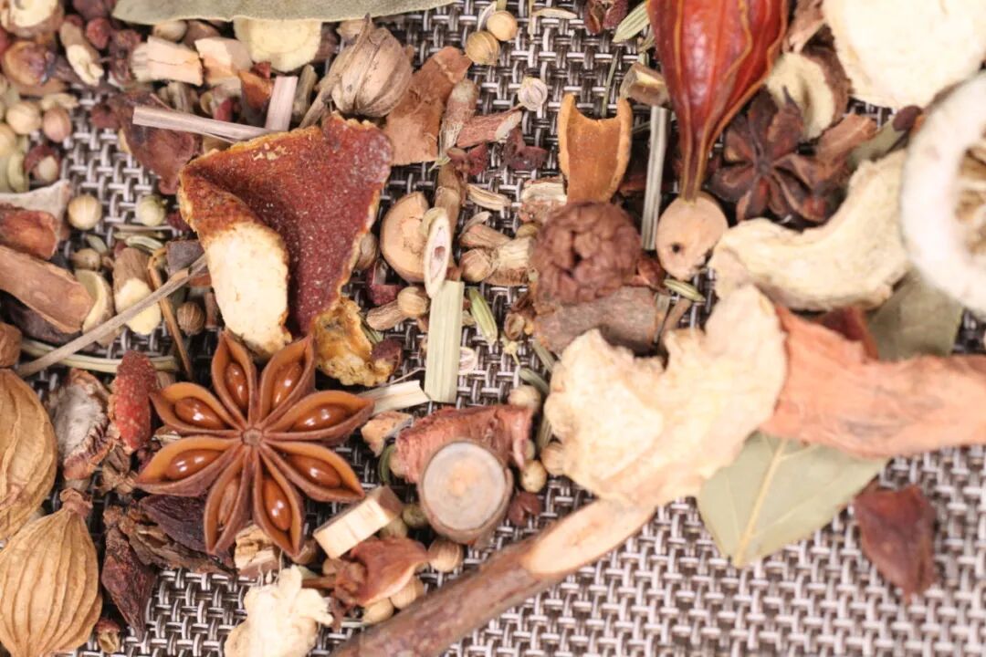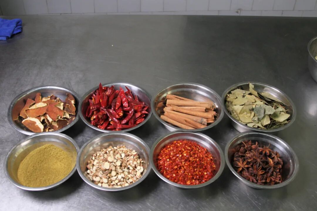 八角、桂皮、小茴、甘草、三奈、甘菘、花椒、砂仁、草豆蔻、草果、丁香。