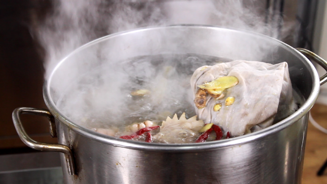3、锅置火上,掺入鲜汤5000克,放入姜葱,调入精盐、味精和糖色,再放入香料包,烧沸后改用小火慢慢地熬至香味四溢时,即成新鲜卤水。