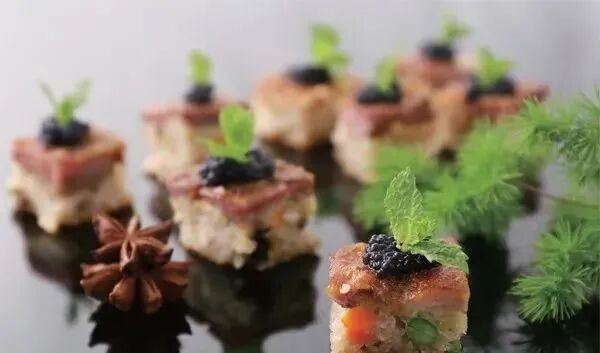 6.走菜时,将鸭方下入热油锅炸至外酥内糯,捞出沥油装盘,并在每块鸭方上面舀上黑鱼子酱,用鲜薄荷叶等点缀即成。