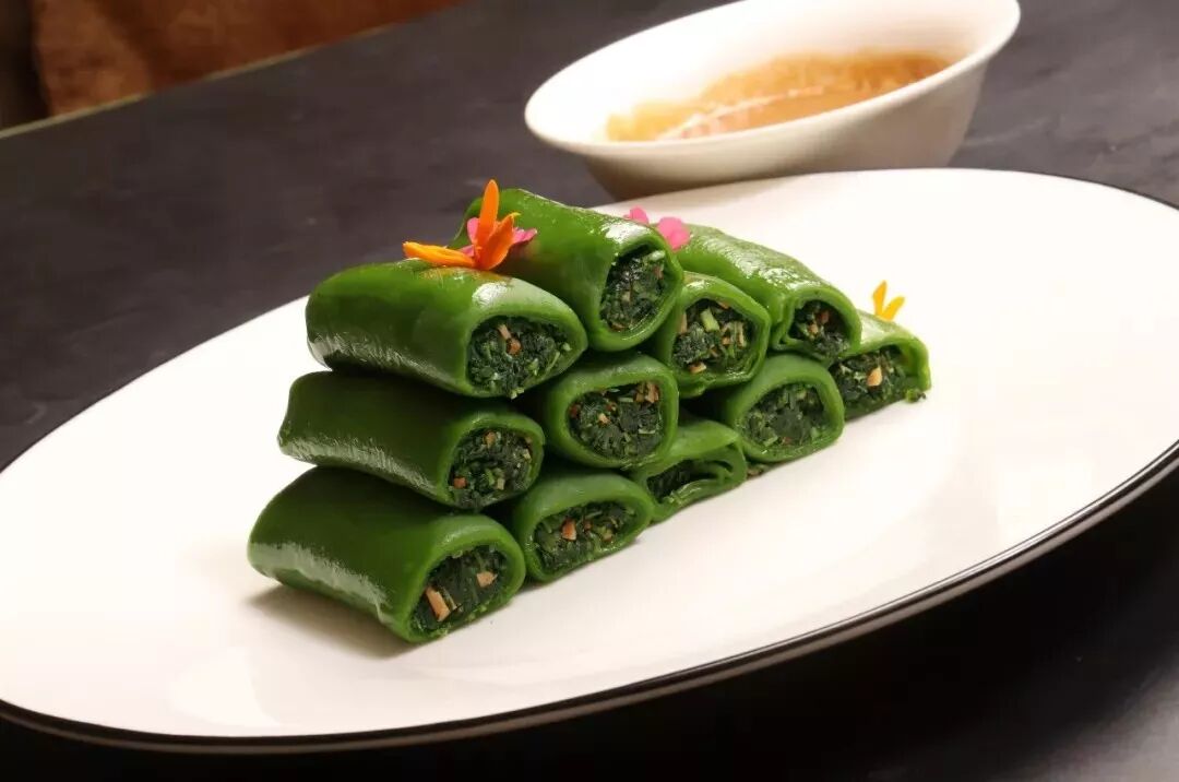 此菜根据“香干马兰头”改良而来,将拌好的马兰头卷入菠菜饼,亦点亦菜,卖相整齐,食用方便,还可蘸食蒜泥麻酱汁,多了一重口味。