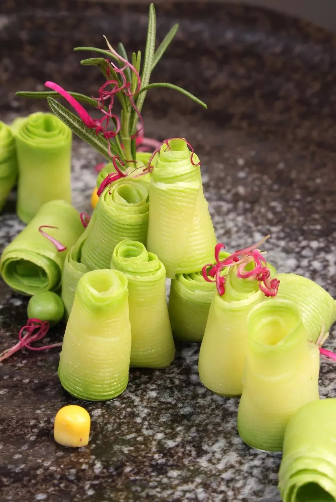 4.让西葫芦卷“站”在盘中,点缀玉米粒、豌豆粒、玫瑰花丝、青草,带一碟蒜泥花生酱即可走菜。