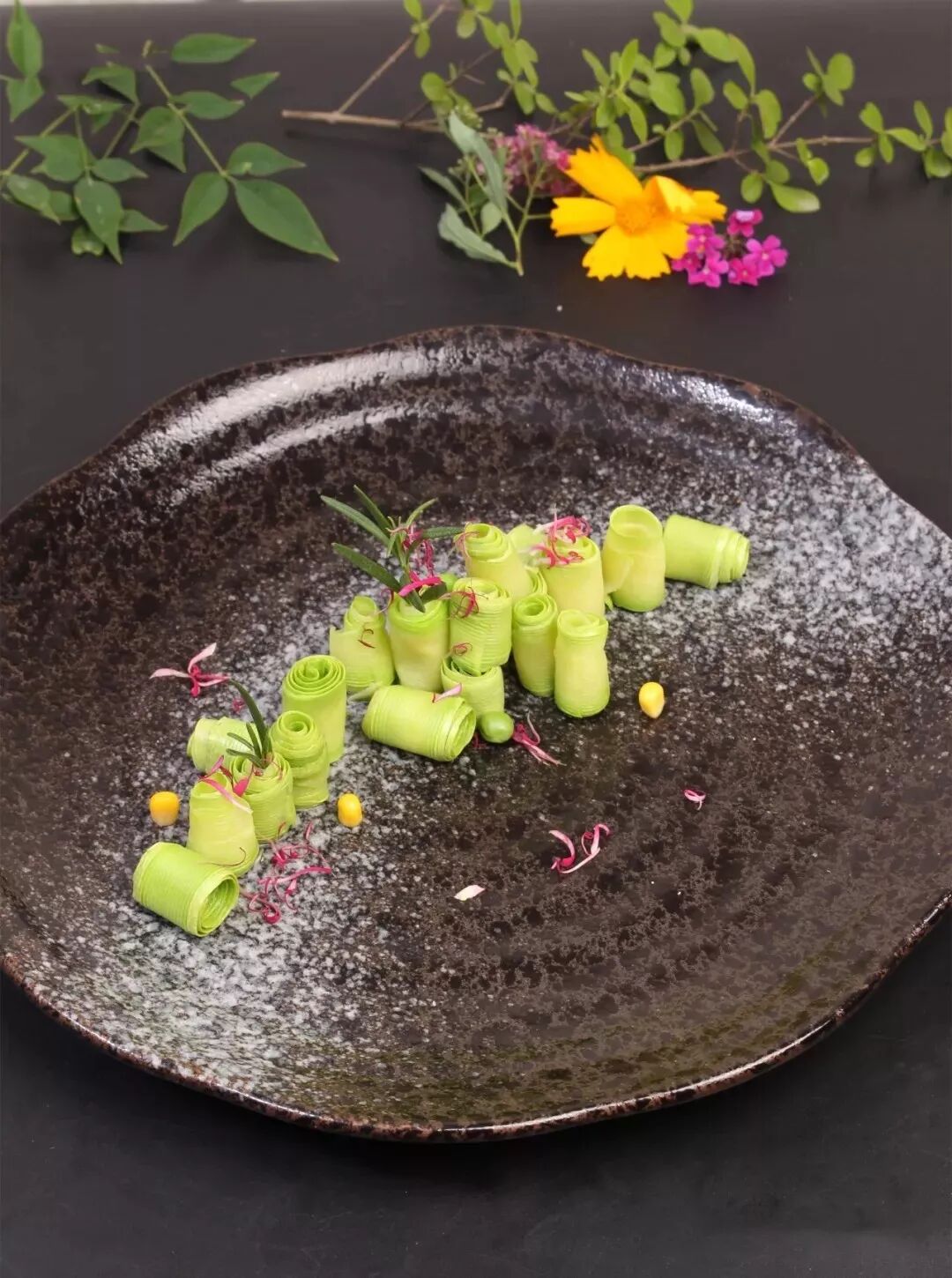 选用每个只有三两重的西葫芦,色泽青绿、含籽较少,生食非常可口,刨皮冰镇后卷成圆柱形,“站”在盘中,吸引了不少食客拍照转发。此菜每天能卖40多份。