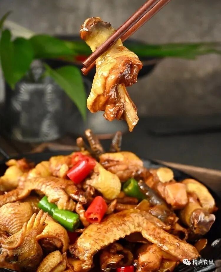 【步骤】1.先将鸡宰杀,留鸡血,去毛,开膛去内脏,清洗干净,改刀成3cmx3cm块状。小米椒切圈,五花肉切0.3cmx4cm大小的片,老姜切0.3cm的片,蒜籽切粒,青红椒切斜片,备用。2.将鲜香菇焯水后过凉备用,鸡血、鸡肠、鸡胗焯水过凉备用。将过凉后的香菇和鸡血垫入干锅底部。3.炒锅上火烧热滑锅,加入菜籽油烧热,下入五花肉小火煸香,加入姜片爆香。倒入鸡块,大火翻炒3分钟左右至鸡肉表皮收缩,加入焯好水的鸡杂、老抽10克,烹入啤酒200克炒香,再兑入纯净水400克烧开。调入精盐8克、鸡精5克、生抽20克,改小火煨10分钟。加入大蒜籽、青椒,至鸡成熟后大火收汁1分钟,起锅装盘。【备注】1.当没有黑脚鸡时,如果有走地土母鸡最佳,但要没下过蛋的鸡,也叫仔母鸡,还有广东的清远鸡也是不错的。总之要用肉质结实点但不要太大的鸡,一般在3斤左右的活鸡,现杀的最好,留鸡血和鸡杂一起成菜。2.杀鸡留血时,碗里要加入精盐2克、冷水80克,再趁鸡血余温将鸡血搅打均匀。等鸡血凝固后,小火隔水蒸熟鸡血,再改方块用冷水泡着备用。3.干锅土鸡配料可以自由搭配,如:土豆、板栗、口蘑、鲜香菇,总之最好是容易成熟的原材料为佳。4.干锅土鸡一般要现做现吃,不能上午做好下午吃,不然鸡肉的口感会差很远。再有喜欢吃面条的可以配上一碗清水面一起上桌,当人少时可以只做半只鸡的量,调配料跟着减半。5.如果把菜籽油换成茶籽油,就是干锅茶油土鸡。如果用砂锅装叫砂锅土鸡。家里只有普通三黄鸡也可以做,但煨鸡的时间只需5分钟,啤酒200克、纯净水只需200克就可以了,其他调味一样,不用加盖煨制,味道也会不错,但比黑脚鸡肉质口感会差点。