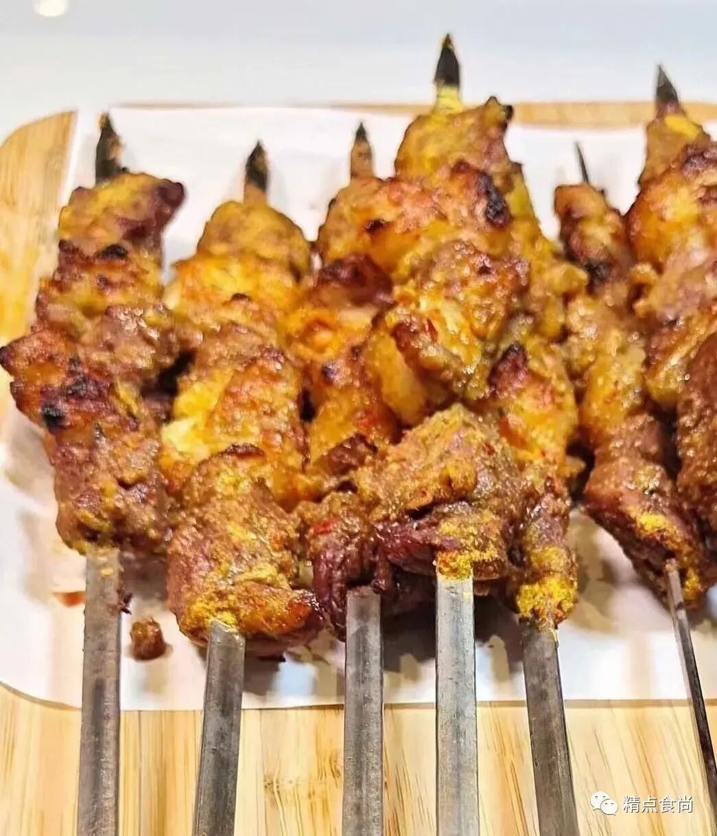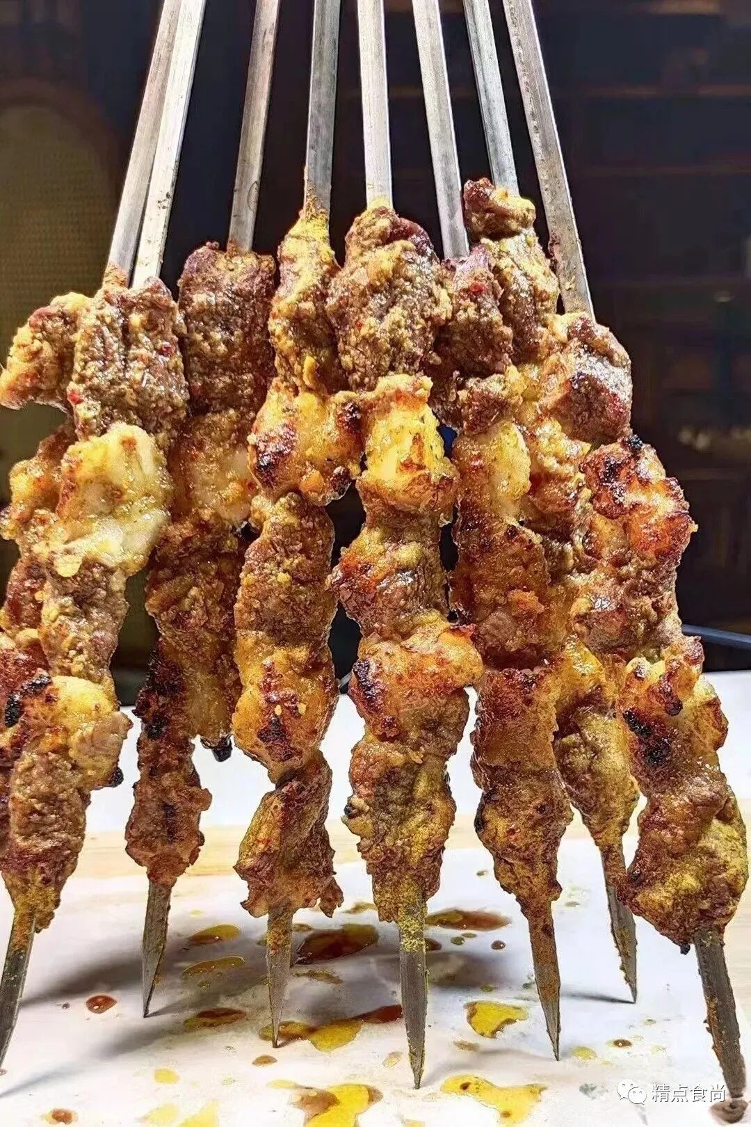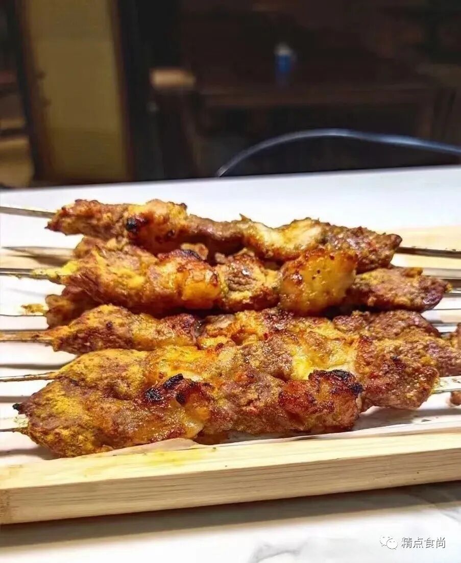 6.烤炉开火加热到65-70度即可,把串好的肉放入调制好的糊内用勺子慢慢淋在肉上面,多余的糊自然脱落即可放在烤炉上慢慢烤。