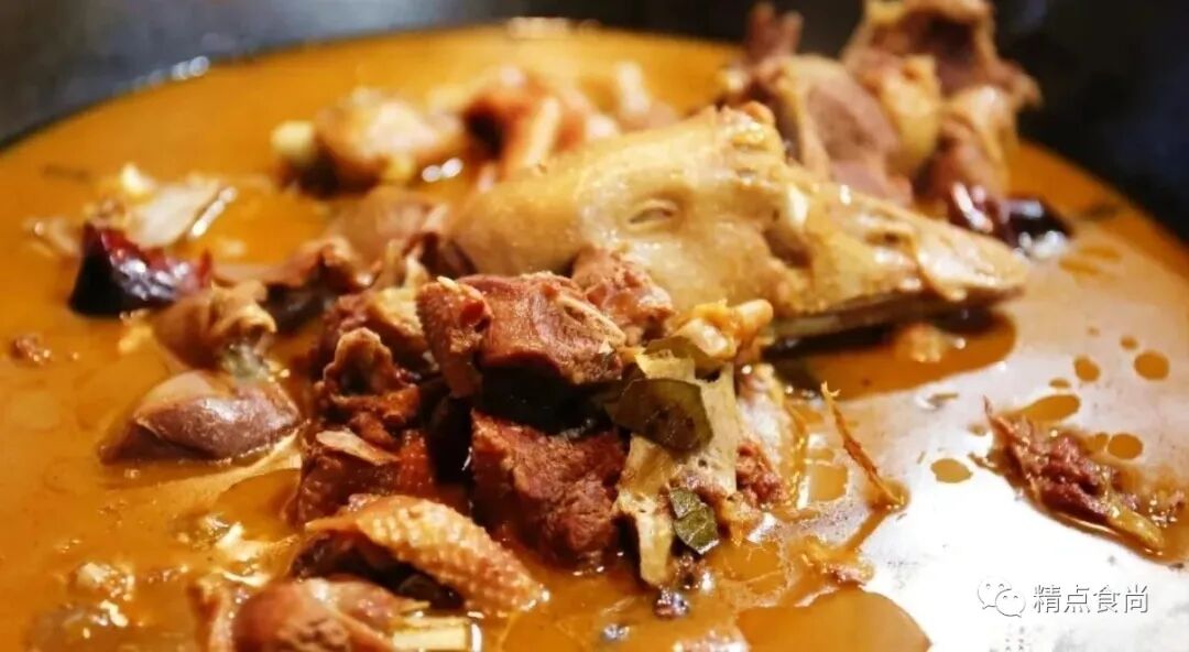 3、倒入大铁锅中,小火慢慢靠烧鹅肉至九成熟,关火将鹅肉泡在原汤汁中,以利于浸泡入味。