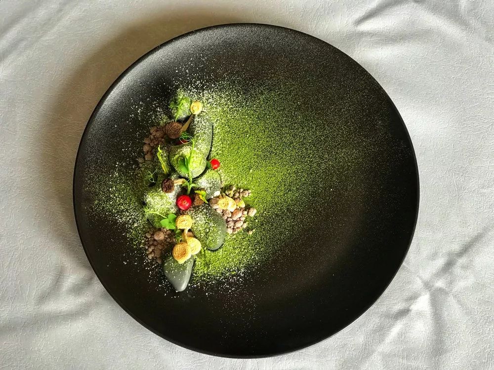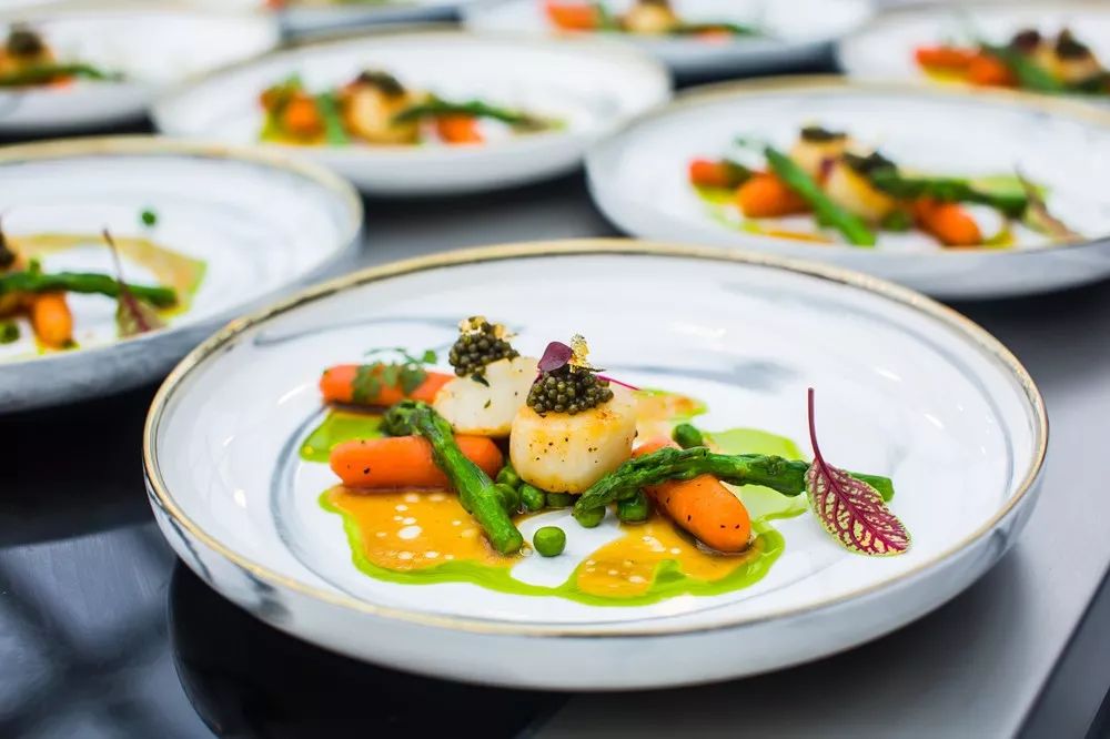 5.两种食材计算好时间,一起与鱼籽酱进行摆盘,淋上香草油即可。