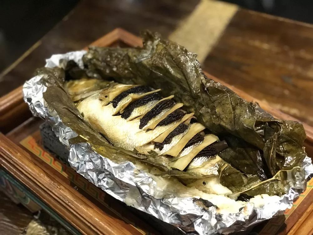 5.锡纸打底,铺上荷叶,再放上鲈鱼包裹好,覆盖上打好的蛋清,抹平,入烤箱上下各200度烤30分钟即可。
