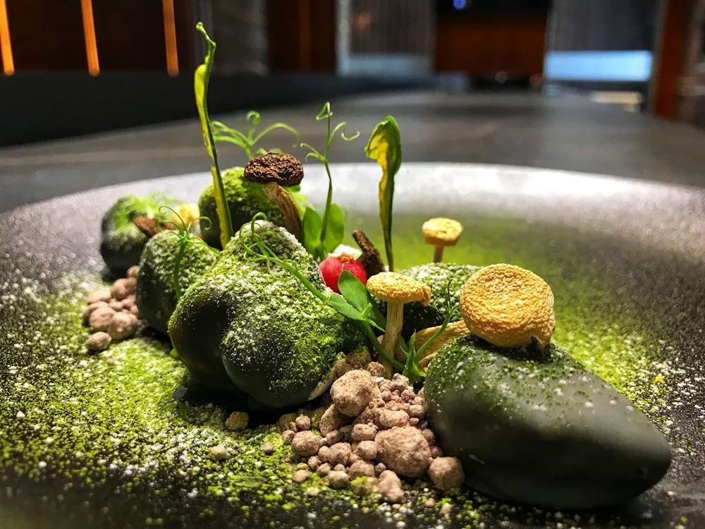 3.取卡露咖鲟鱼籽酱放在生蚝肉上,放上拌好的香草油麦芽糊精,底下铺上沙冰即可。
