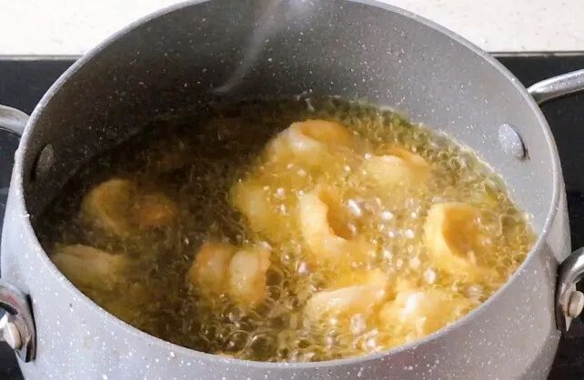 虾仁裹上淀粉,入油锅炸成金黄色。