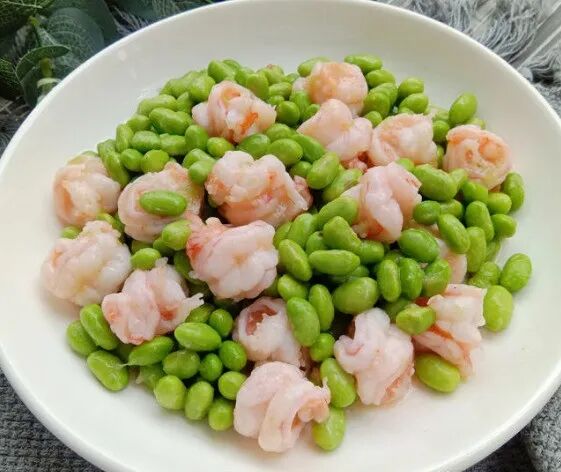 锅内加油,烧热后倒入虾仁,炒到变色后盛出。再倒入姜丝、毛豆翻炒,炒到毛豆熟透。