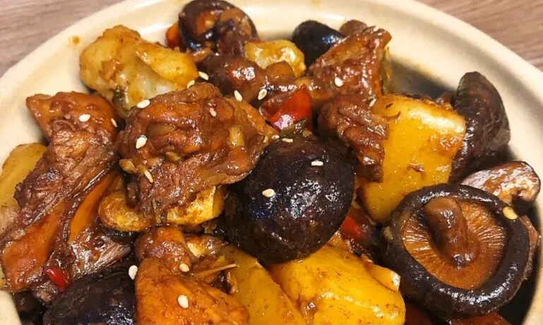 再倒入香菇,大火炖煮,煮开后转小火,炖到鸡肉断生,最后倒入土豆,炖到土豆熟透,再收汁即可。
