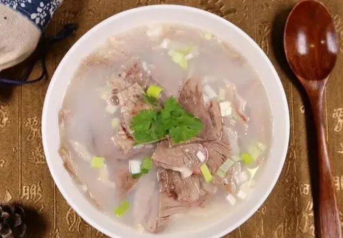 羊肉放凉后切成薄片,倒进羊汤中,稍微煮几分钟。