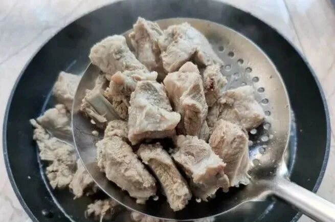 排骨剁成小块,清洗几遍,将骨渣、血水去掉,再倒进锅内,加入凉水、一勺料酒,大火煮出浮沫,用勺子撇净。