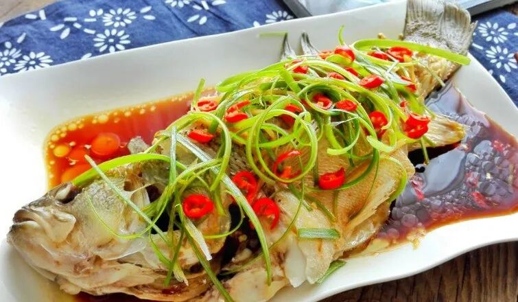 再放上新鲜葱姜丝、小米椒。倒入少许蒸鱼豉油,淋上热油,这道清蒸鲈鱼就做好了,好吃不腻。