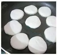 煎锅倒入70克油,中火加热,至油温四成热时转小火,下入生坯慢慢煎制,小火将一面煎好