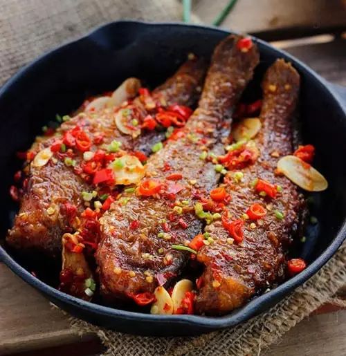 倒入炸好的鱼,入水鱼身2/3处,大火闷煮,期间鱼翻身一次,收汁轻晃锅,入盐、入糖提鲜,出锅
