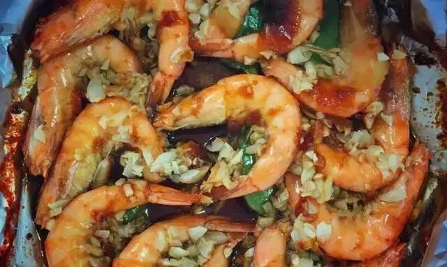 3、烤盘中摆入锡纸,将腌制好的虾摆在中间;