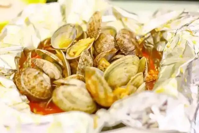 3、 两层锡纸垫于锅底,倒入文蛤、基围虾,并将粉丝、金针菇、豆芽放入其中;