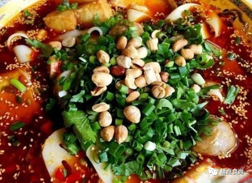 取容器倒入盐、鸡粉、味精各10克,撒入芹菜末、蒜蓉、葱花各50克,放入秘制豆豉酱10克、炒熟的白芝麻5克、花椒面5-10克,淋入芝麻油、炼香的鸡油各30克,红油60克,再注入烧开的步骤2调好的汤料750克,放入冒熟的食材,最后撒入剁碎的鲜小米椒(用量根据食客的嗜辣程度来调整)、香菜3克、花生碎5克即可。